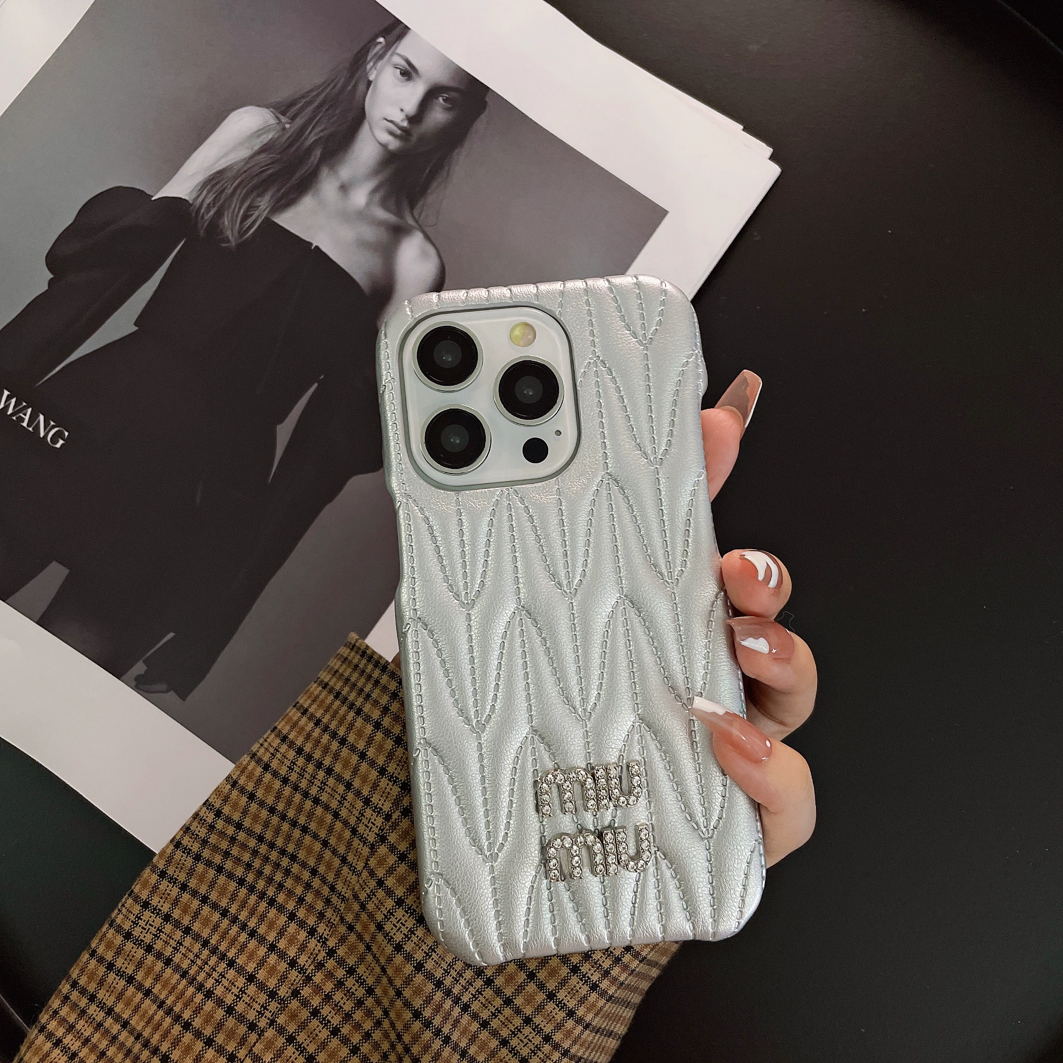 Ou Que العلامة التجارية العصرية الجديدة m home flash منقوش بالألماس 15 مناسبة لحافظة الهاتف المحمول Apple 14promax iPhone13 موديل نسائي 12pro جلد 14 ذهبي فاخر شخصية فضية طراز سيدة راقية
