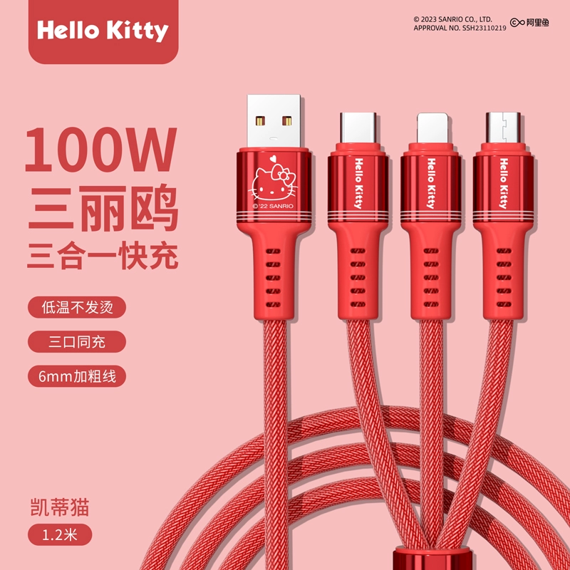 كابل بيانات سانريو كابل شحن ثلاثة في واحد واحد إلى ثلاثة 100 وات شحن سريع سينامون دوج متعدد الرؤوس لهاتف أبل هواوي