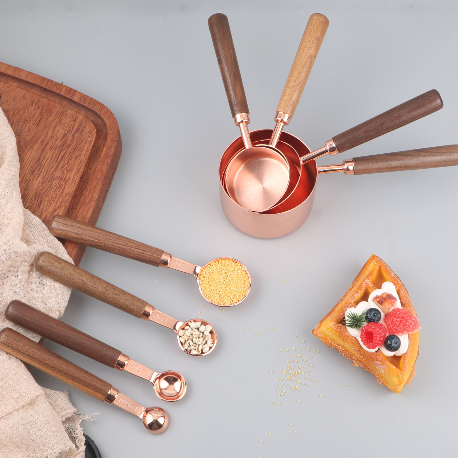 ملعقة قياس من الفولاذ المقاوم للصدأ 8 قطع بمقبض خشبي من خشب الجوز باللون الذهبي الوردي للمطبخ المنزلي وملعقة قياس 15 مل