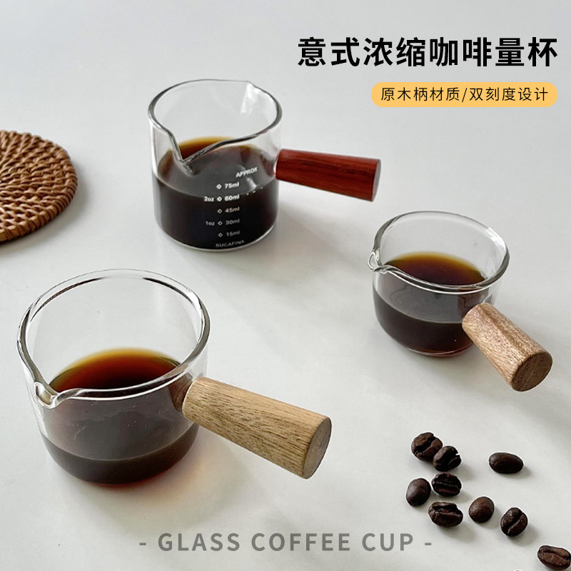كوب حليب إسبرسو إيطالي من الزجاج مع مقياس استخراج كوب قياس كوب حليب صغير كوب بمقبض خشبي صغير