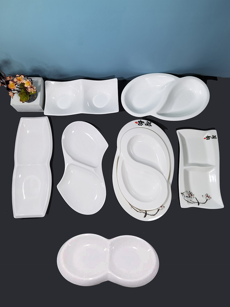طبق من الميلامين طبق للوجبات السريعة مكون من مقصورتين، طبق بورسلين مقلد سميك أبيض، صينية بلاستيكية، طبق أرز مستطيل، طبق مقسم، طبق مزدوج المقصورة
