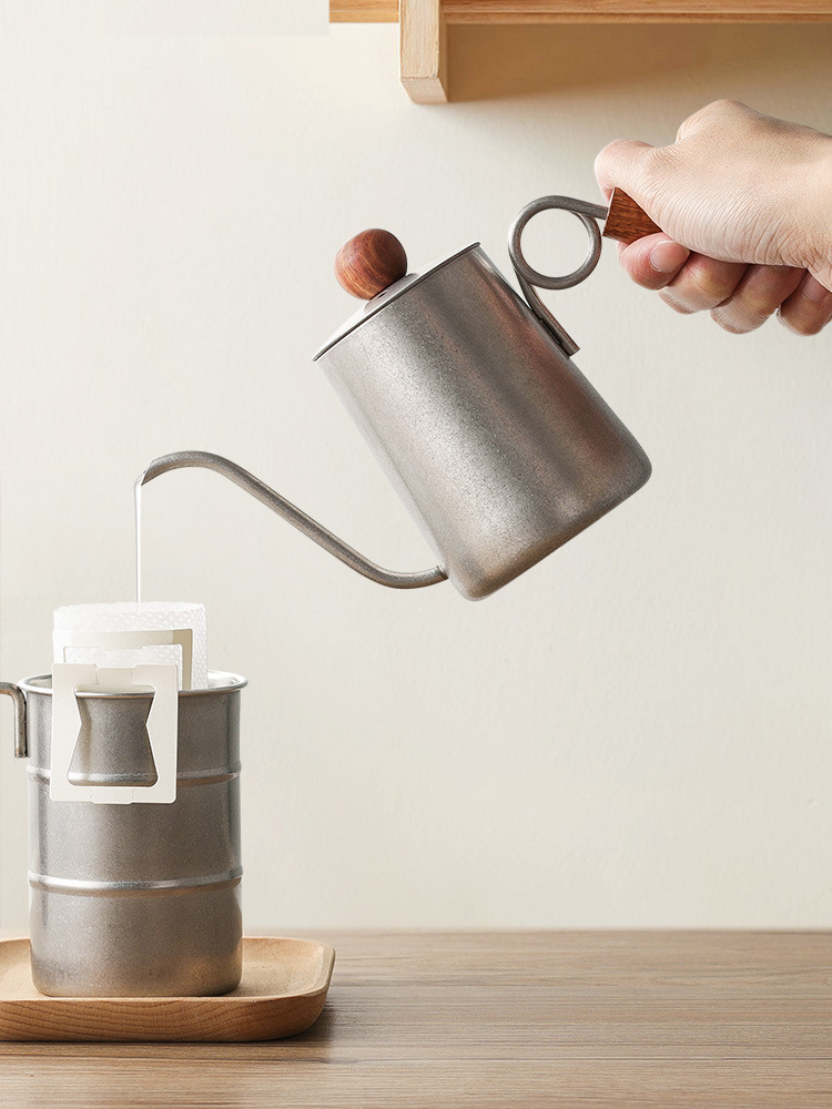 إبريق قهوة يدوي 9QXC 304 من الفولاذ المقاوم للصدأ مع غطاء معلق للأذن وعاء يدوي منزلي صغير رفيع الفم وعاء طويل الفم شعار