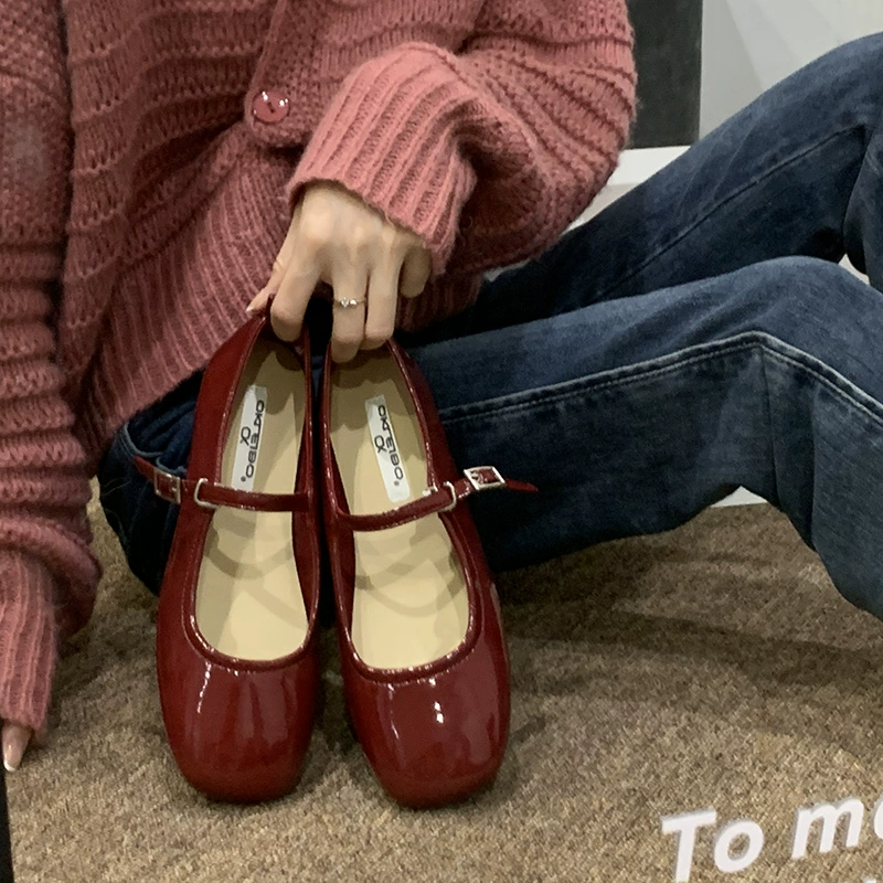 حذاء Ocean One أحمر صغير مربع الشكل ومقدمة مستديرة كلاسيكية فرنسية بإبزيم مسطح بلون سادة حذاء Mary Jane