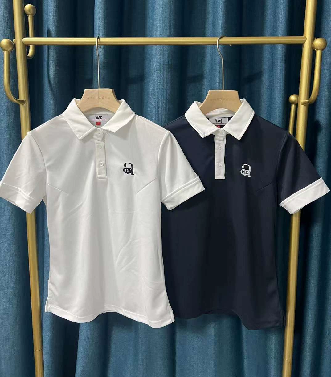 D012 زي الغولف الكوري الصيفي للسيدات، طية صدر السترة ذات العلامة النصية، نصف زرر، متعدد الاستخدامات، بأكمام قصيرة T