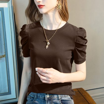 1688 clothes wholesale short sleeve T-shirt women's new solid color half sleeve cotton T-shirt pleated bubble sleeve design top women