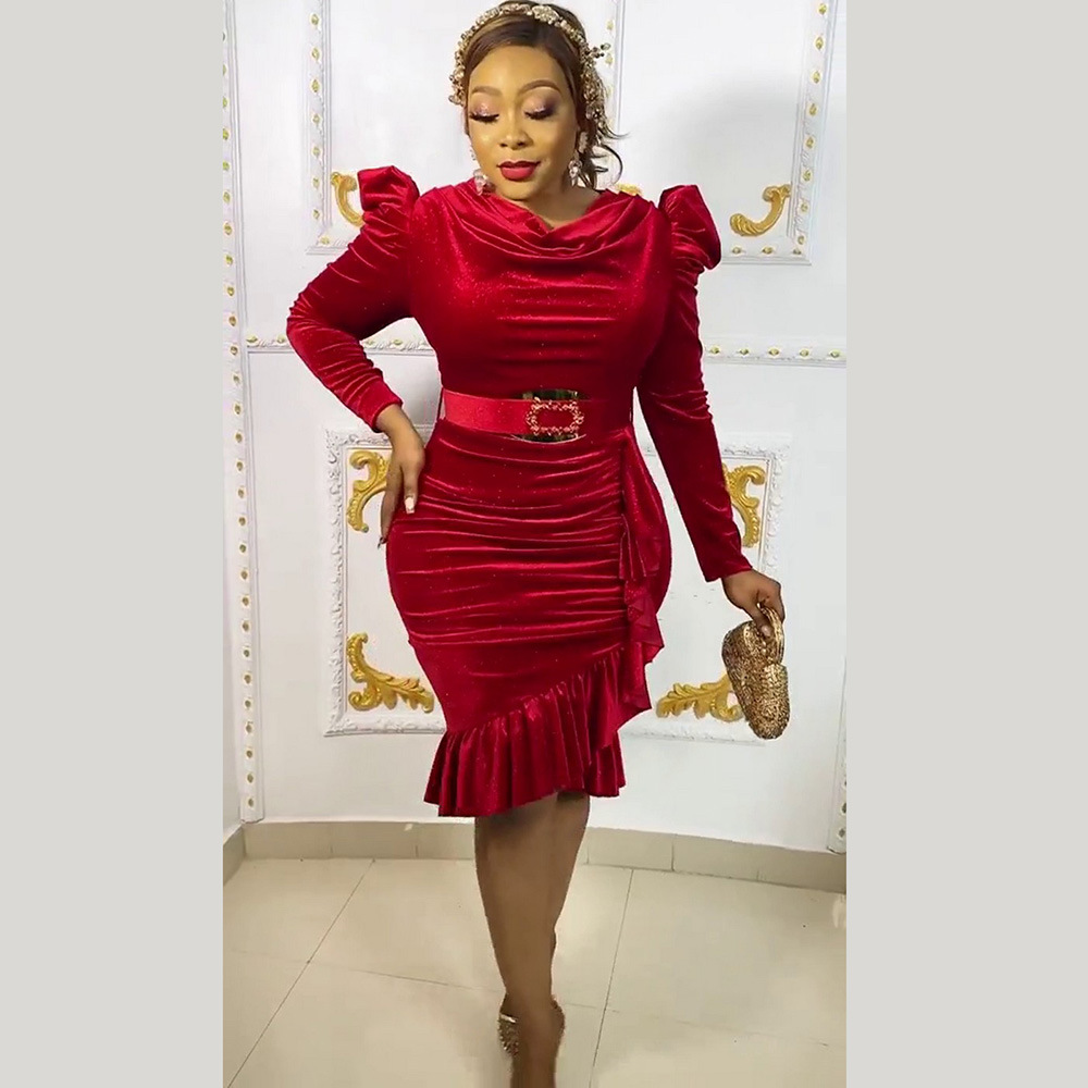 2022 فساتين راقية للسيدات الأوروبية والأمريكية الأفريقية عبر الحدود من أمازون قماش مرن مخملي ذهبي برونزي مع حزام