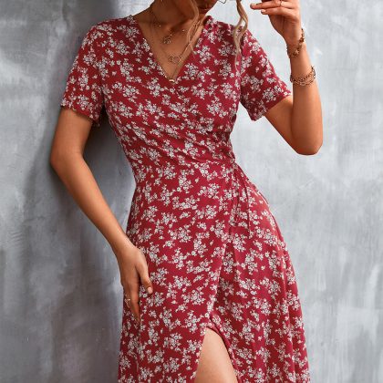 2022 spring and summer new independent station Amazon hot selling popular cross V-neck lace-up flower split dress women