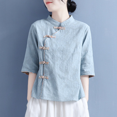 2022 summer retro Chinese style artistic cotton and linen jacquard diagonal buckle stand collar half sleeve Tang suit Chinese style top for women
