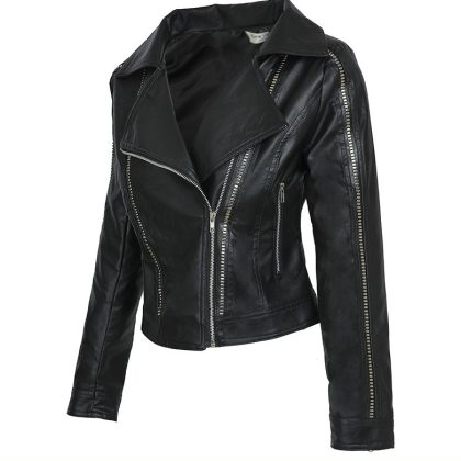 2023 AliExpress New European and American Zipper Stitching Short Leather Jacket PU Leather Lapel Leather Jacket