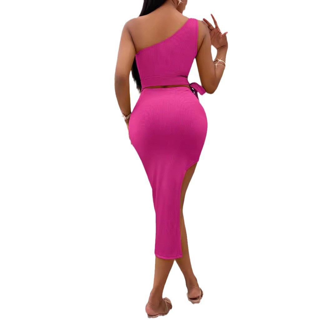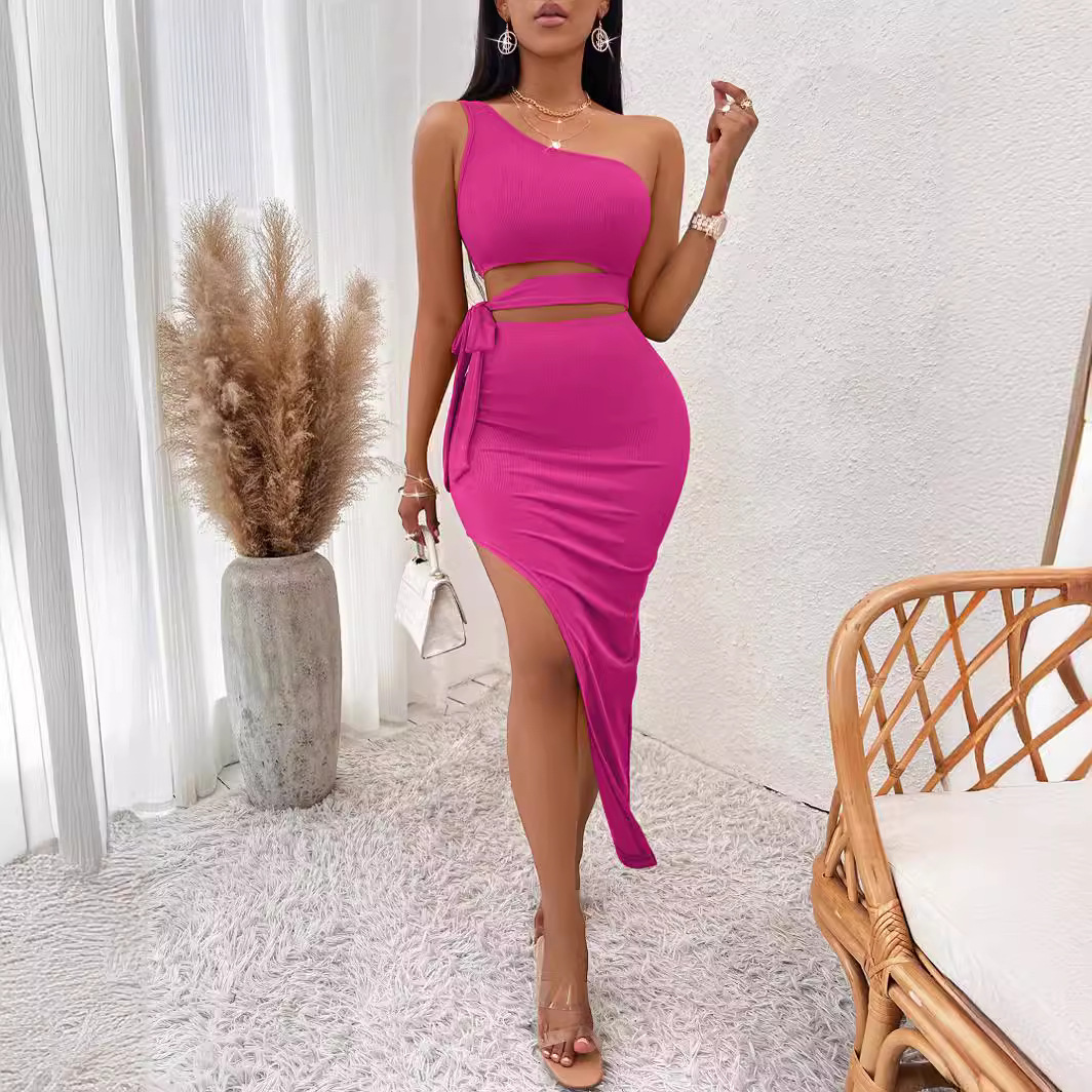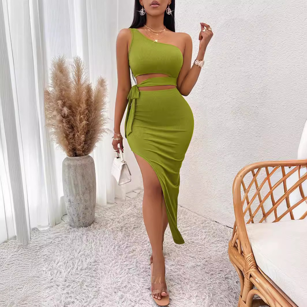| nameOriginal | 2023 Amazon European and American New Foreign Trade Women's Summer Casual Solid Color Oblique Collar Tie Waist Knitted Hip Dress |