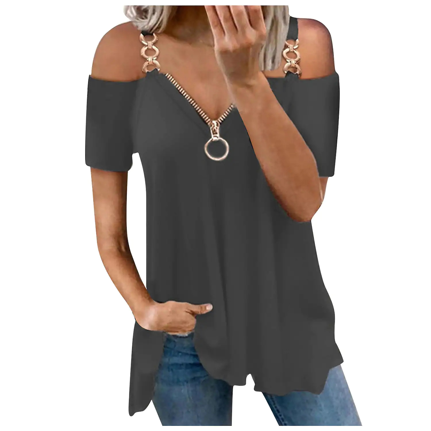 | nameOriginal | 2023 Amazon Women's Summer New Slim-fit Slimming V-neck Zipper Shoulder Solid Color Sling Short-sleeved T |