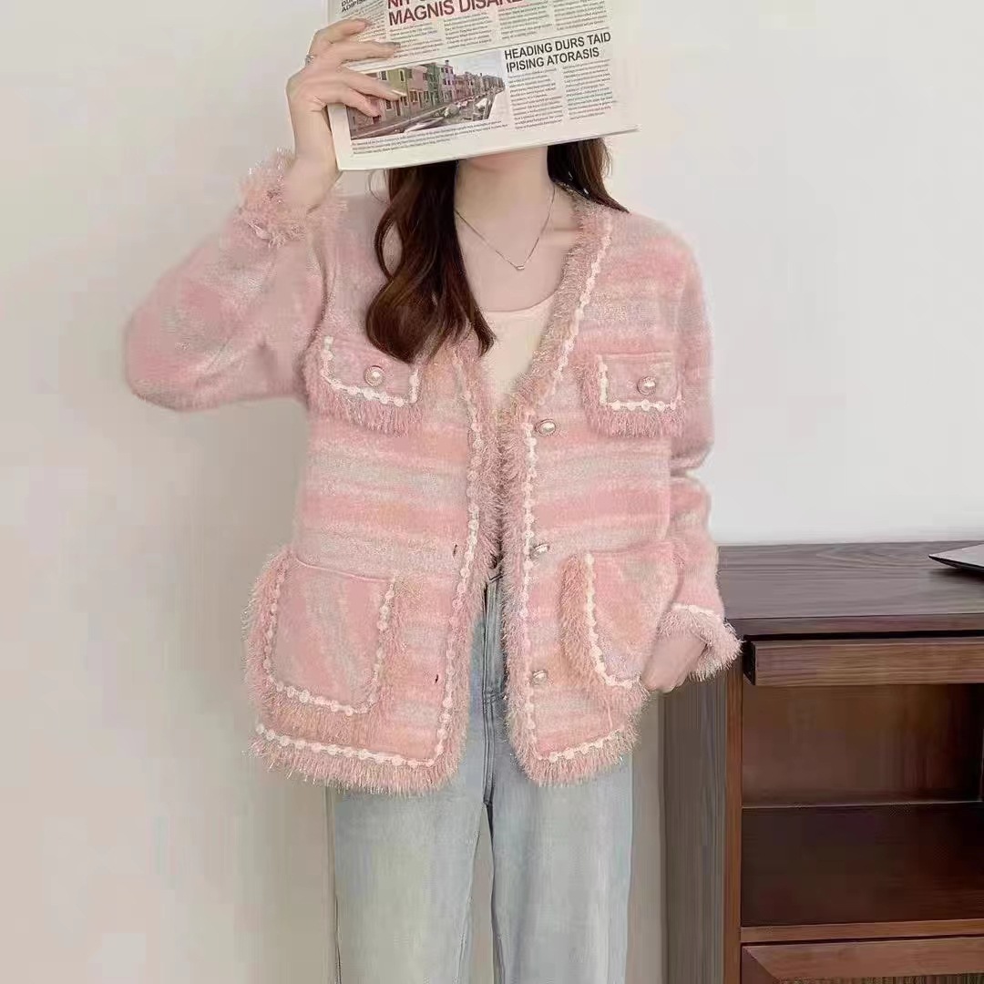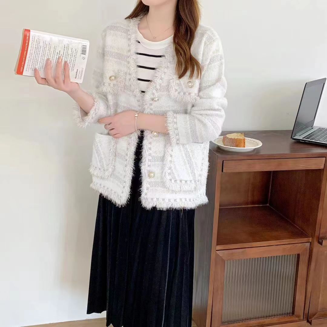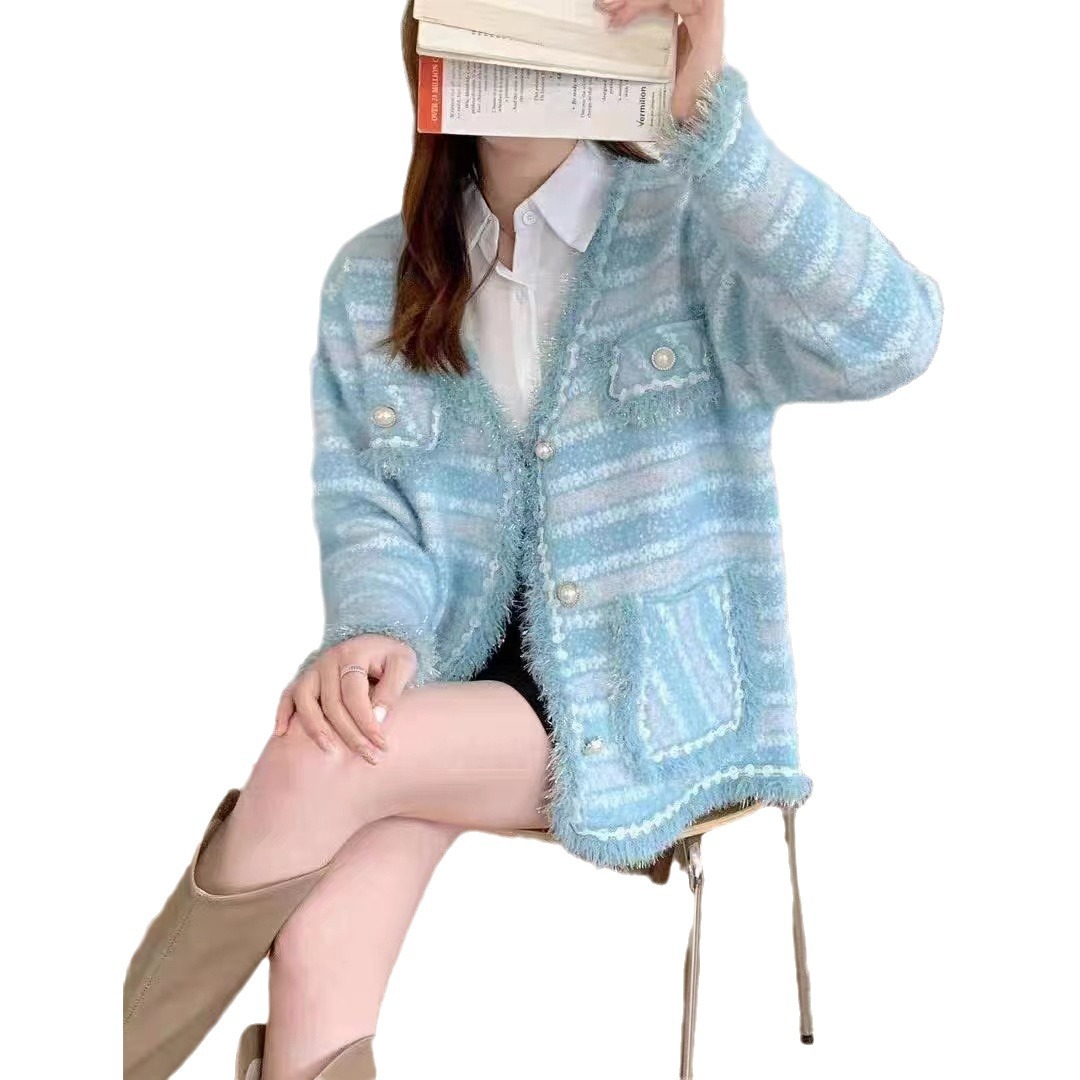 2023 autumn and winter New color matching V-neck sweet Chanel style coat women's frayed faux mink velvet striped knitted cardigan