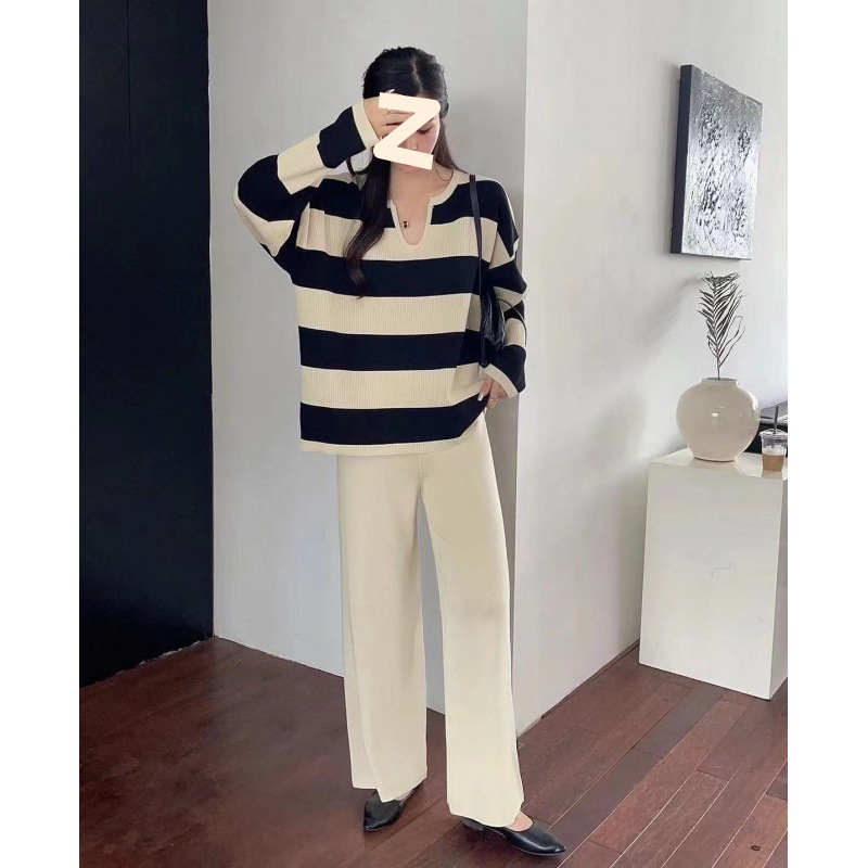 | nameOriginal | 2023 autumn and winter retro contrast color striped lazy loose collar slimming knitted cardigan casual loose wide-leg pants for women |