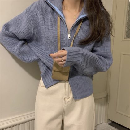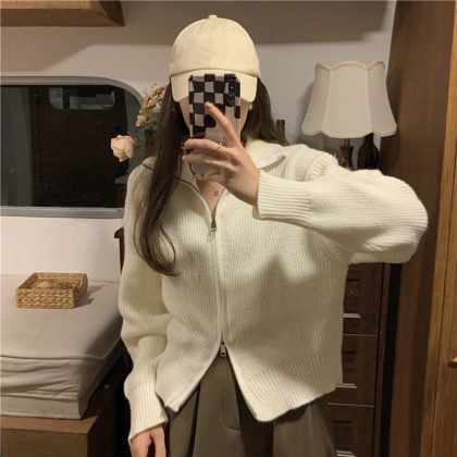 | nameOriginal | 2023 autumn new solid color knitted cardigan three-dimensional design sense double zipper long sleeve sweater short coat wholesale |