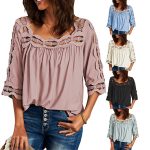 2023 الأوروبية والأمريكية الأمازون الصيف جديد المرأة الدانتيل خياطة ساحة طوق فضفاض عادية نصف كم تي شيرت للنساء