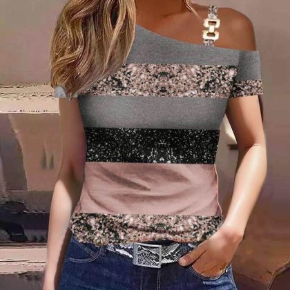 2023 Independent Station wish Amazon Explosions Summer Simple Short-sleeved Metal Buckle Printed Top T-shirt Women's Clothing