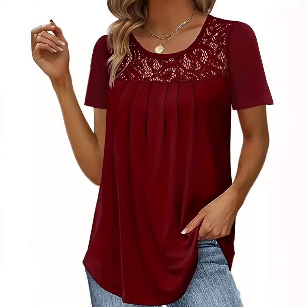 | nameOriginal | 2023 New Amazon AliExpress European and American women's fashion top neckline lace short sleeve solid color T-shirt |