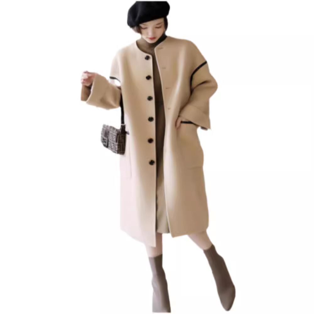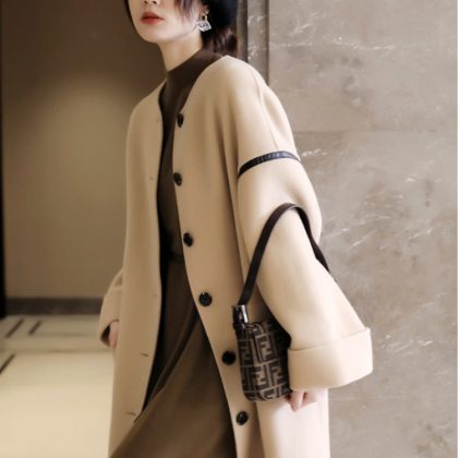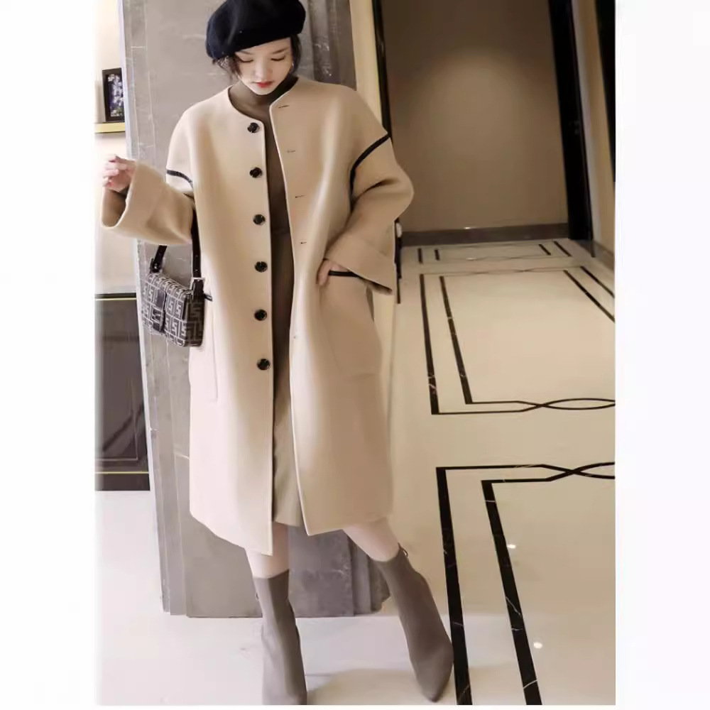 | nameOriginal | 2023 new French modern patchwork leather design micro wide collarless long cashmere double-sided woolen coat |
