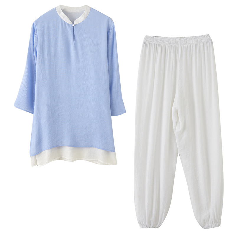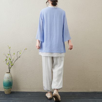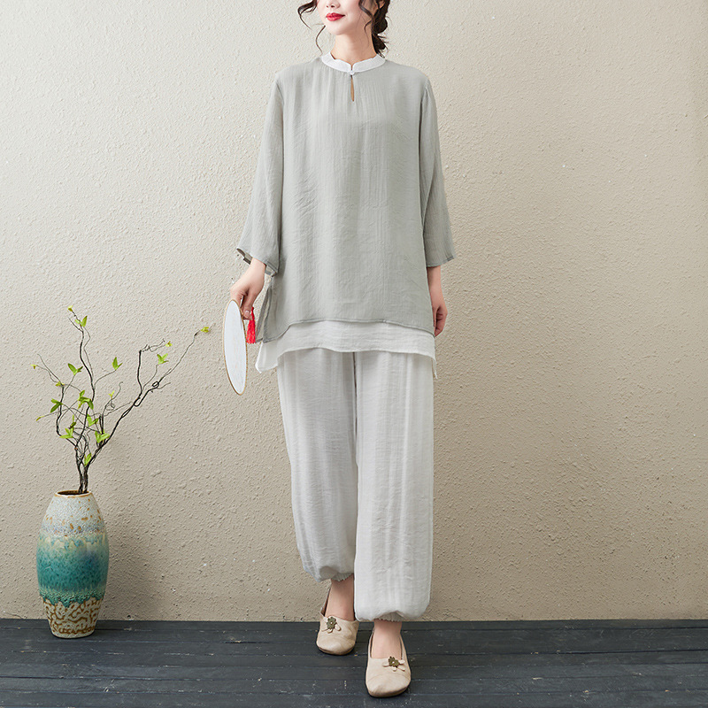 | nameOriginal | 2023 new retro ethnic style cotton and linen Zen clothing nine-quarter sleeve top elastic waist trousers two-piece set suit women |
