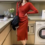 | nameOriginal | 2023 new v-neck long sleeve dress waist slimming autumn and winter light mature gentle wind matching coat knitted long |