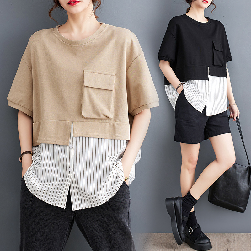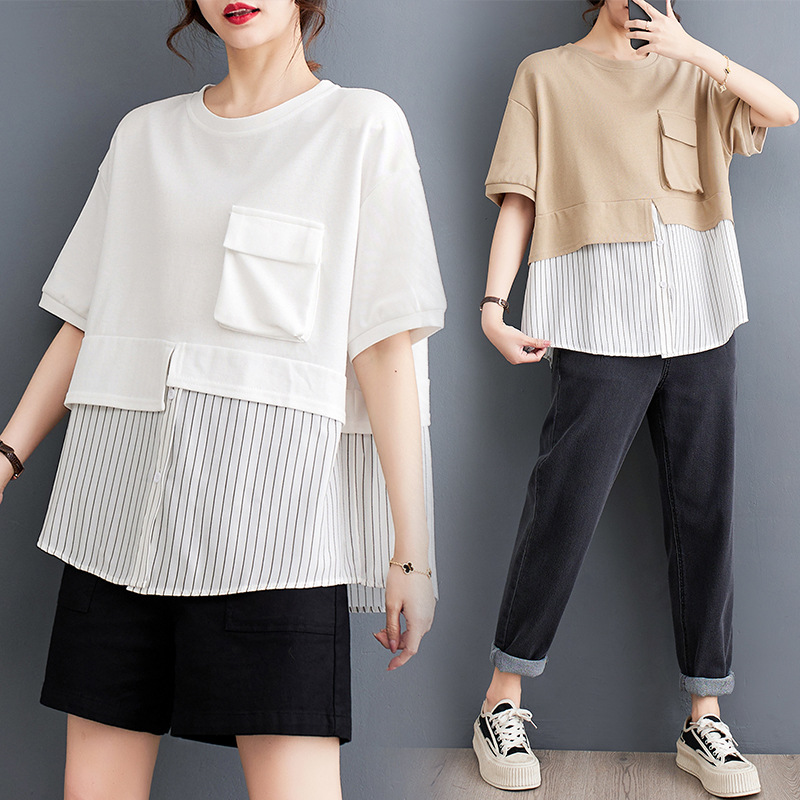 | nameOriginal | 2023 Summer New Fat Girl Stylish Age-reducing Loose Casual Fashion Striped Stitching Large Size Short Sleeve T-shirt |
