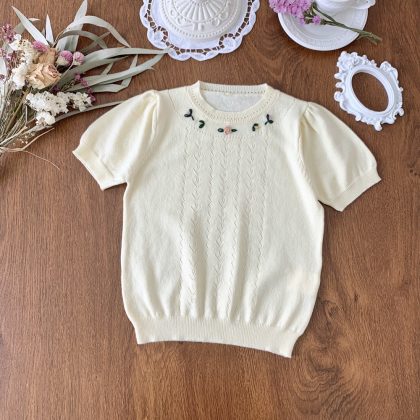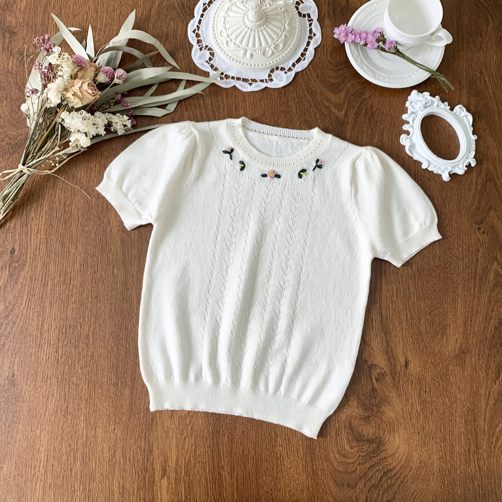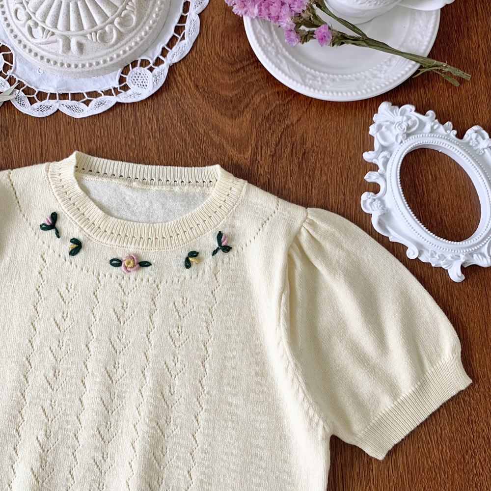 2023 Summer New Girls' Cotton Yarn Short-sleeved Knitted Sweater Hollow Thin Threading Handmade Embroidered Short-sleeved Knitted Sweater