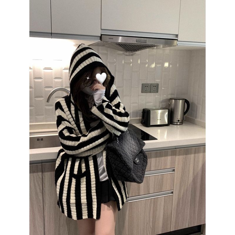 2024 autumn and winter black and white striped hooded coat loose lazy style mid-length knitted cardigan women's casual large sweater