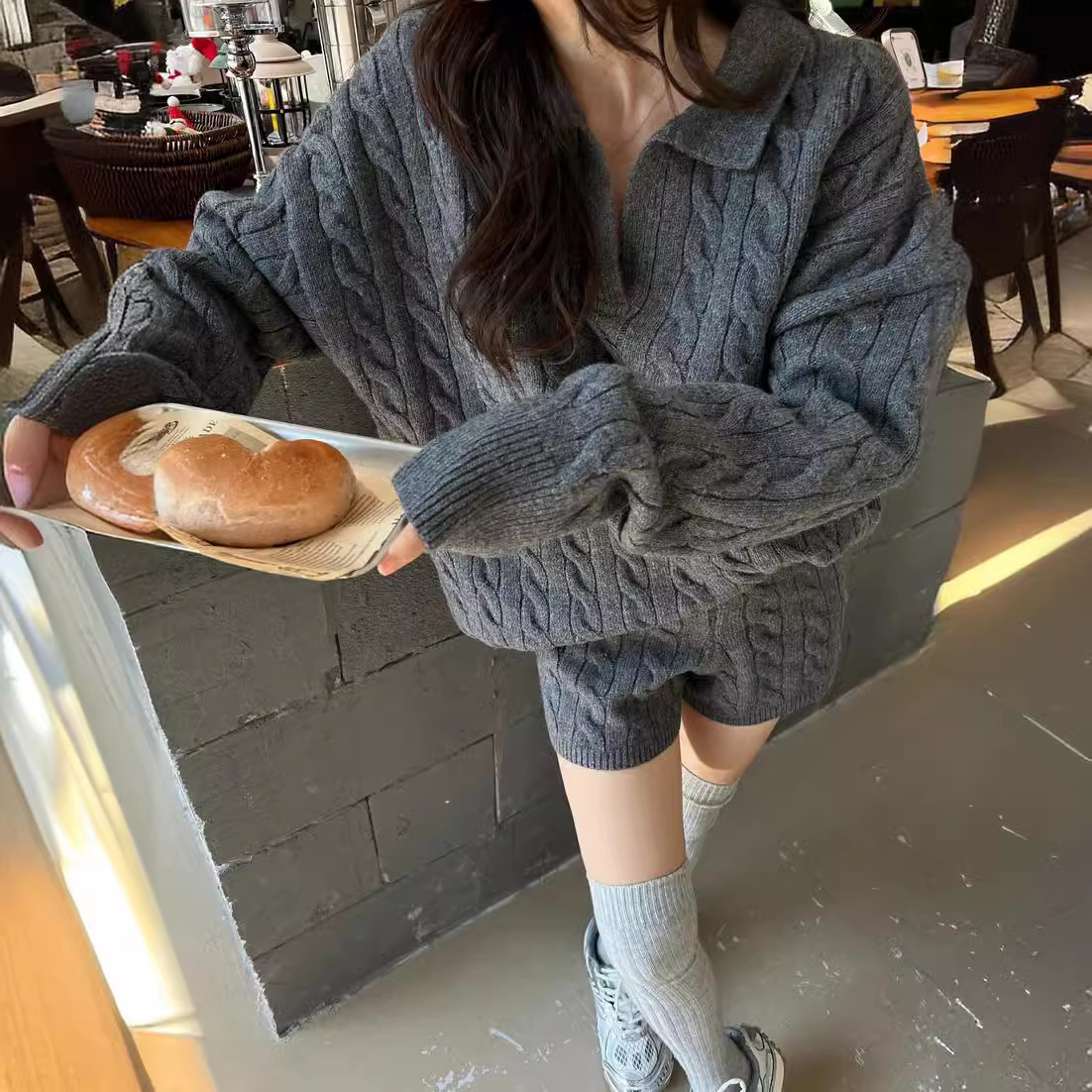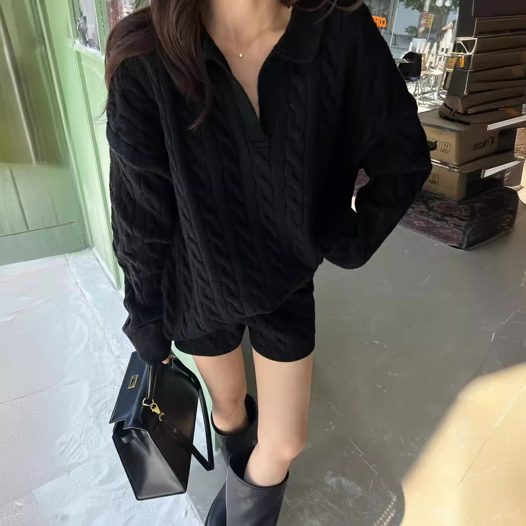 | nameOriginal | 2024 autumn and winter Korean style new elegant two-piece polo collar twist top knitted sweater shorts suit women |