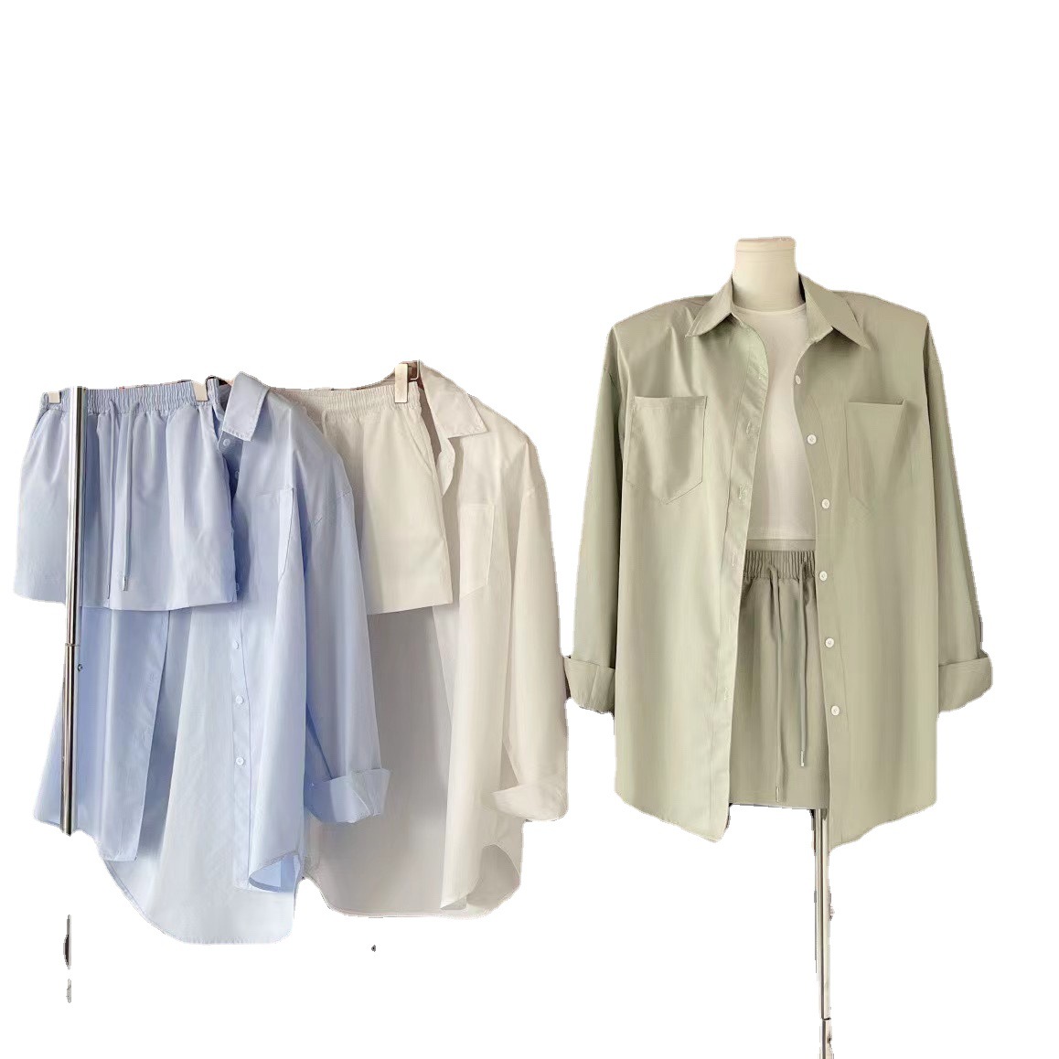 2024 Early Spring and Autumn New Korean Style Lazy Style Loose Long-sleeved Solid Color Sunscreen Shirt Short Skirt Two-piece Suit for Summer