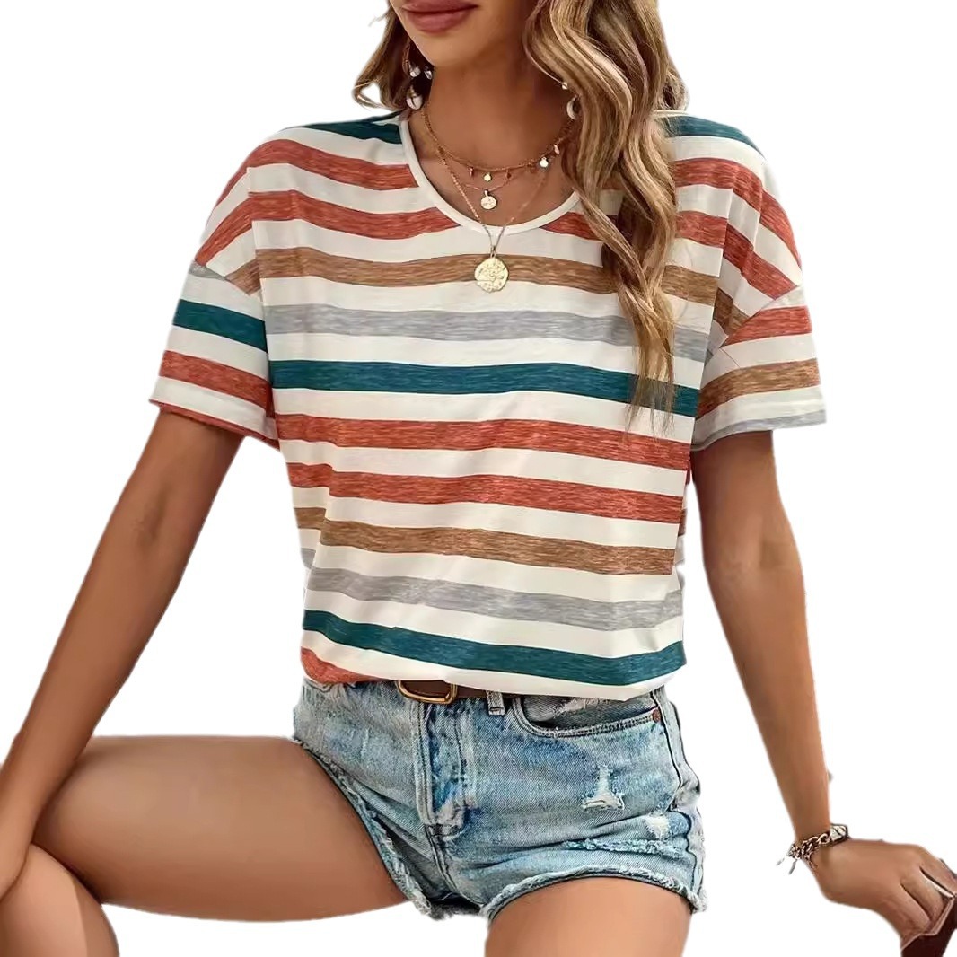 | nameOriginal | 2024 European and American Amazon New Women's Clothing Pattern Casual Round Neck Striped Multicolor Short Sleeve Overseas Hot T-Shirt Top |
