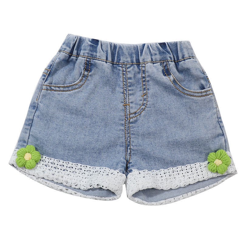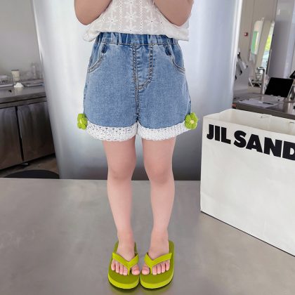 2024 Girls' Shorts Summer New Korean Style Children's Lace Lace Casual Girls' Denim Shorts Trendy