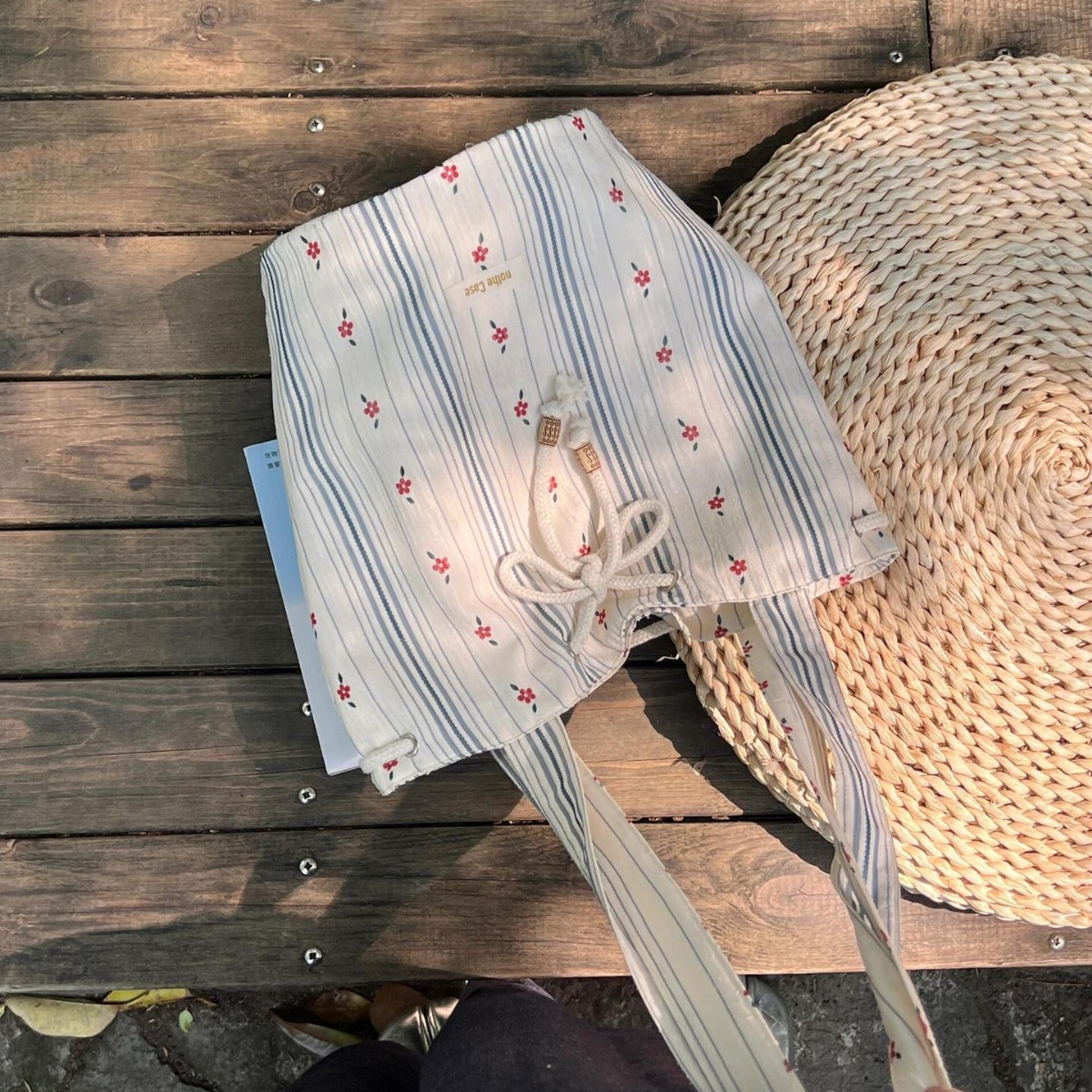 2024 New Arrival South Korea Striped Floral Drawstring Summer Canvas Bag Underarm Bucket Women's Plant Style Shoulder Tote Bag