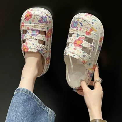 2024 New Croc Shoes Women's Summer Outerwear Cartoon Cute Print Non-Slip Thick Sole Shoes with Shit Feeling Baotou Sandals