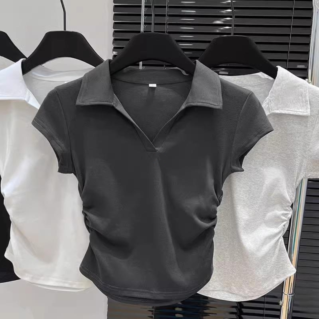 | nameOriginal | 2024 New Design Sense Tight Waist Polo Collar Shoulder Short Sleeve Women's Top Summer American Style Hot Girl V-neck Slim Fit Pleated |