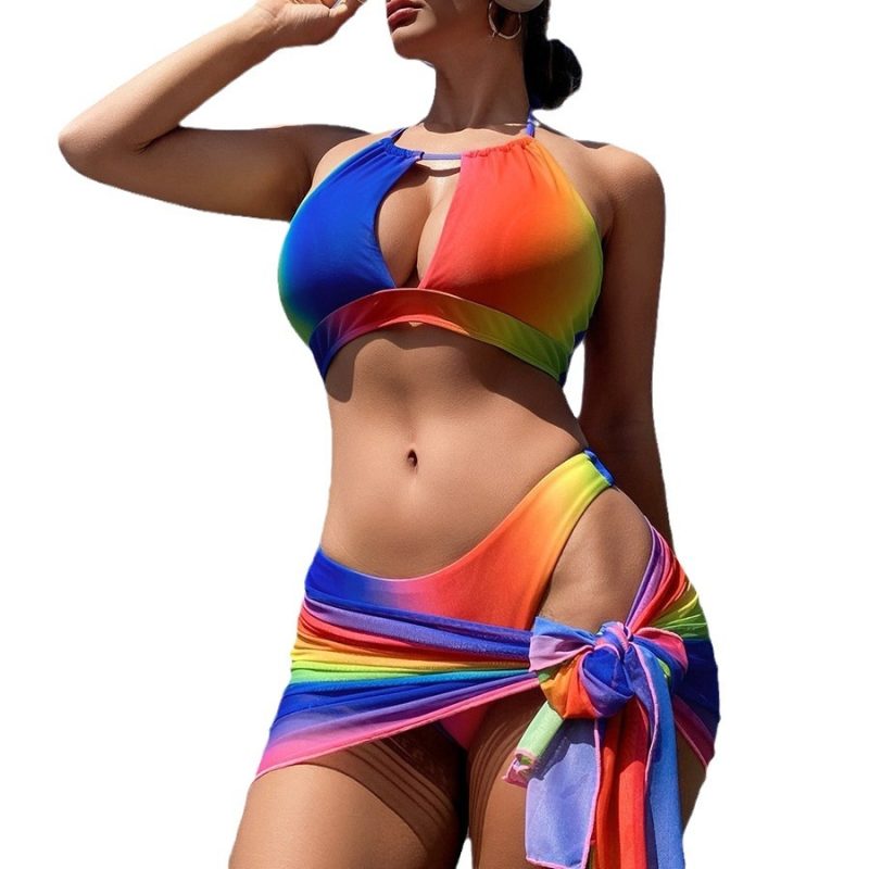 | nameOriginal | 2024 New European and American Cross-border Women's Three-piece Bikini Rainbow Strip Printed Gather Hollow Amazon Swimsuit |