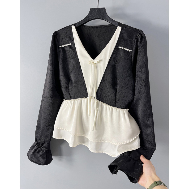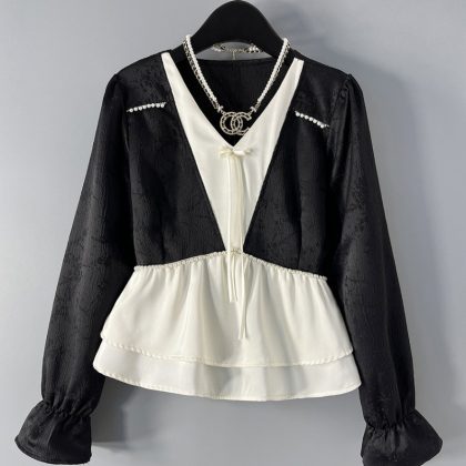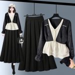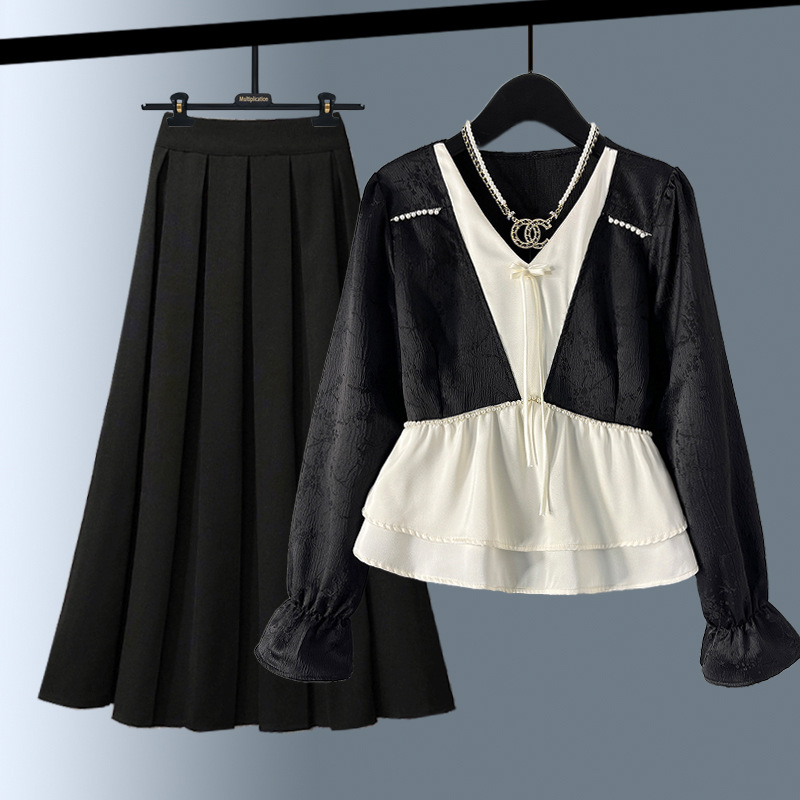 2024 New Fashion fake two-piece stitching women's ruffled shirt + skirt two-piece set