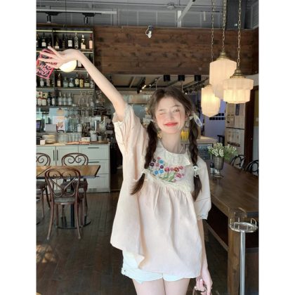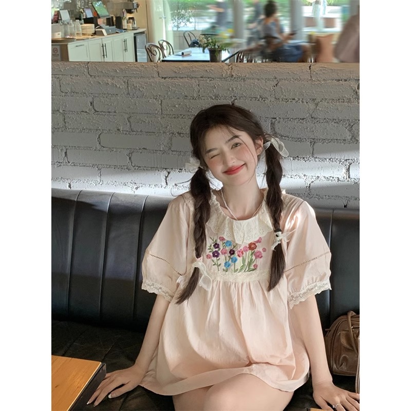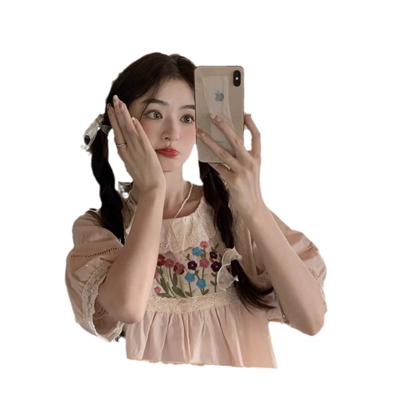 | nameOriginal | 2024 New French Puff Sleeve Shirt Women's Spring Sweet Lacy Collar High Waist Short Sleeve Top |