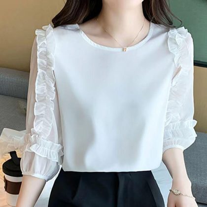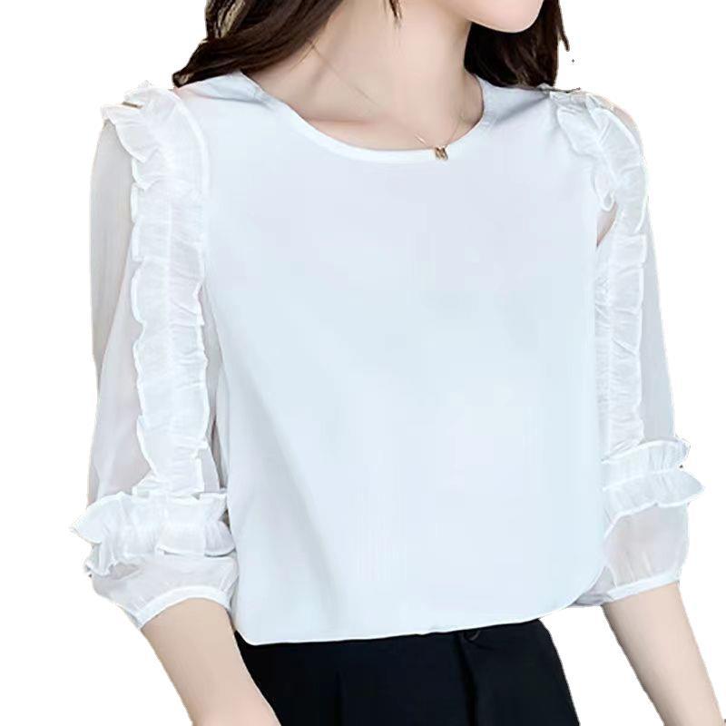 nameOriginal | 2024 New Lace Ear-rimmed Chiffon Shirt Women's New Loose Slimming Age-reducing Seven-sleeved Shirt Round Neck Top |