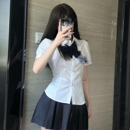 2024 جديد الربيع والصيف الرياح النقية الساخنة الفتيات قصيرة الأكمام الخصر جوكر النمط الأكاديمي ضئيلة JK حزام قميص التعادل البدلة