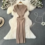 2024 new summer Korean version retro V-neck waist slimming temperament mid-length knitted hip-covering dress short-sleeved