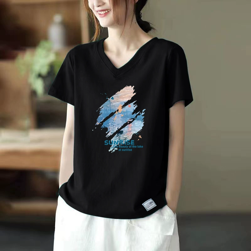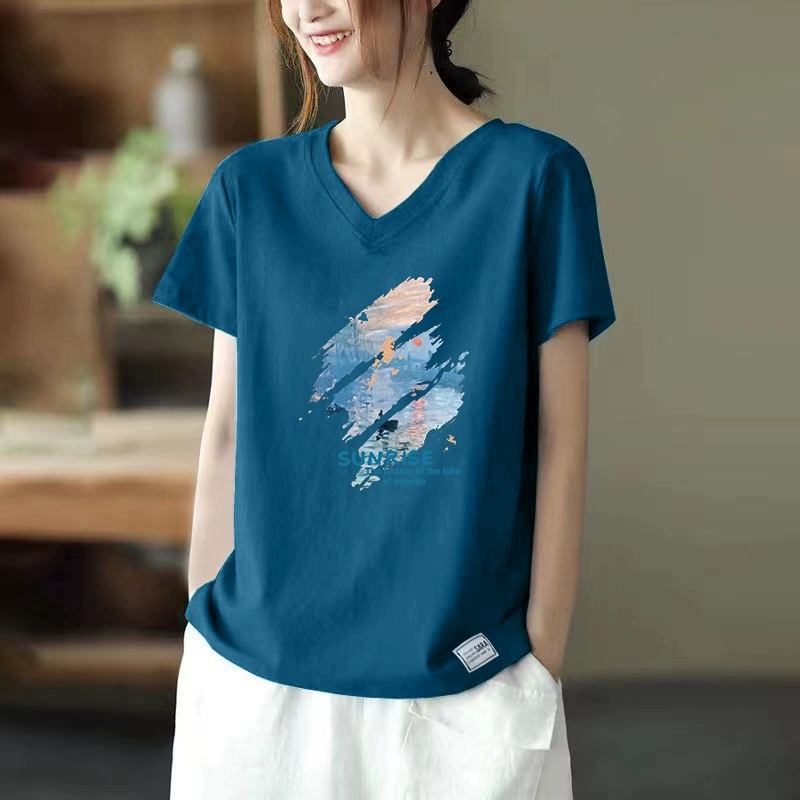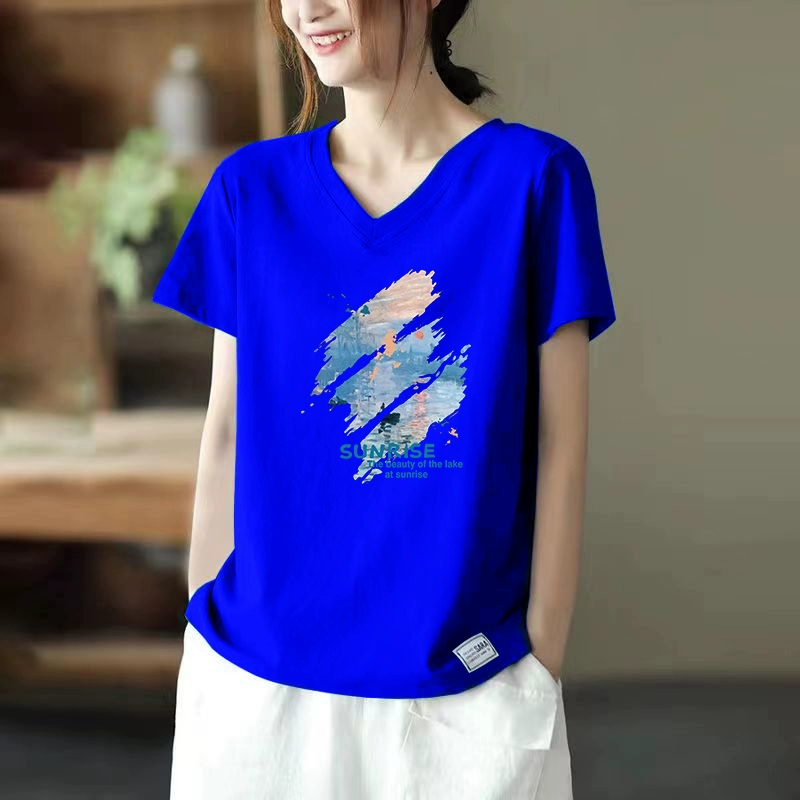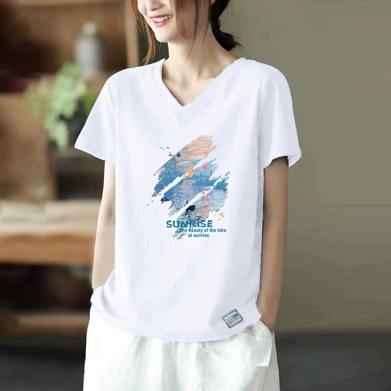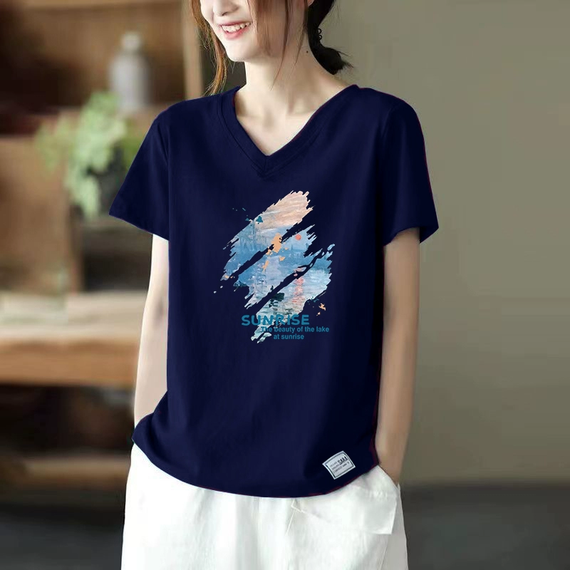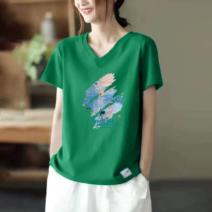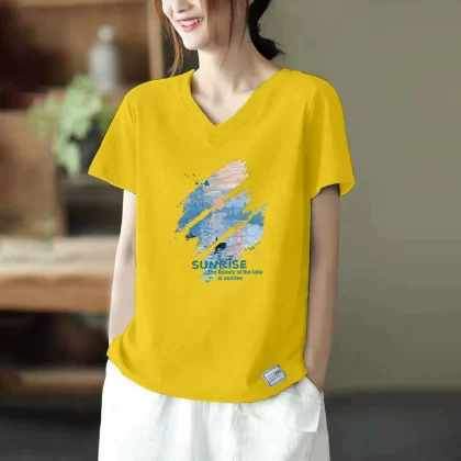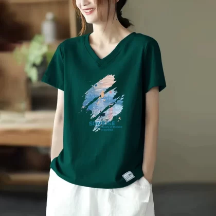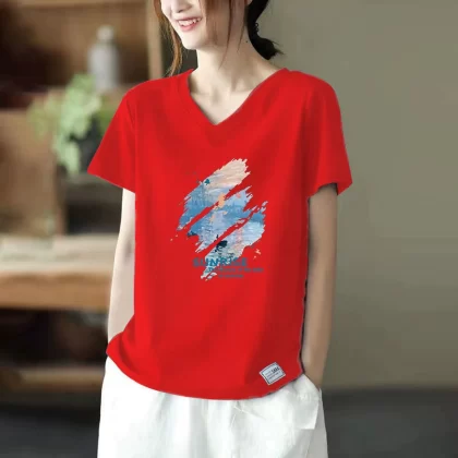 تي شيرت فضفاض بأكمام قصيرة وياقة على شكل قلب جديد لعام 2024