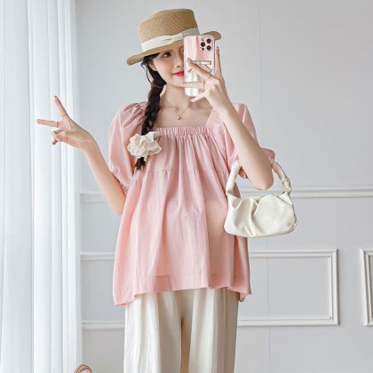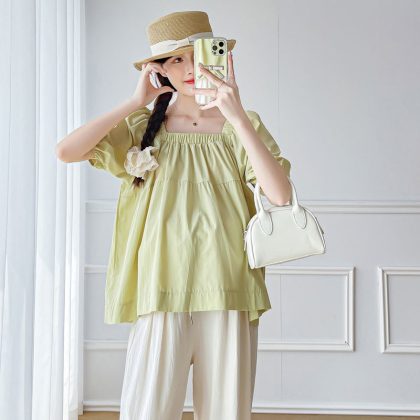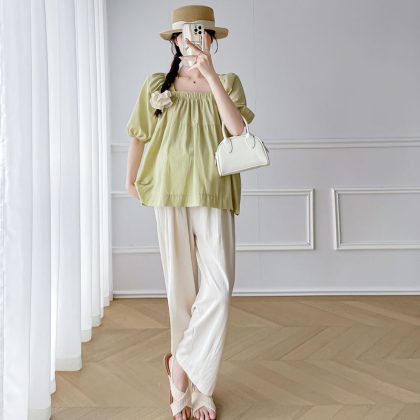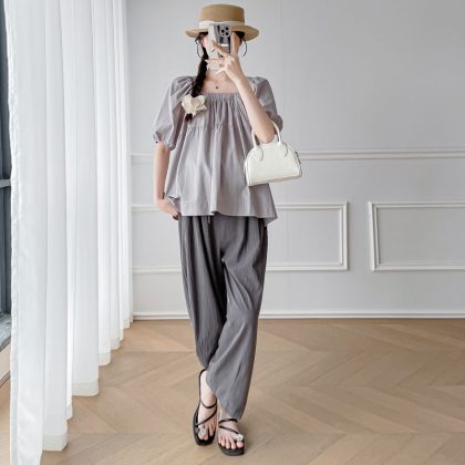 | nameOriginal | 2024 Pregnant Mother Summer Shoulder Short Sleeve French Design Puff Sleeve Square Collar Top + Casual Straight Pants Set |
