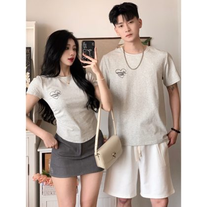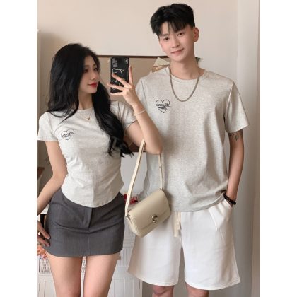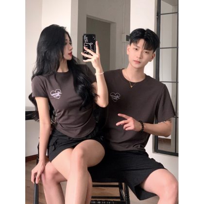 2024 لقطة حقيقية زوجين فستان الصيف الكتف تي شيرتات قصيرة الاكمام المتخصصة تصميم الكورية نمط التخسيس الرجال والنساء جيل من الشعر