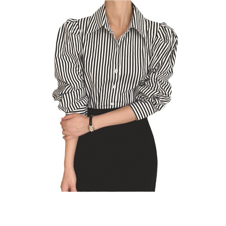 | nameOriginal | 2024 Spring and Autumn New Fashion Elegant Design Sense Bubble Long Sleeve Top Women's Vertical Stripe Shirt |