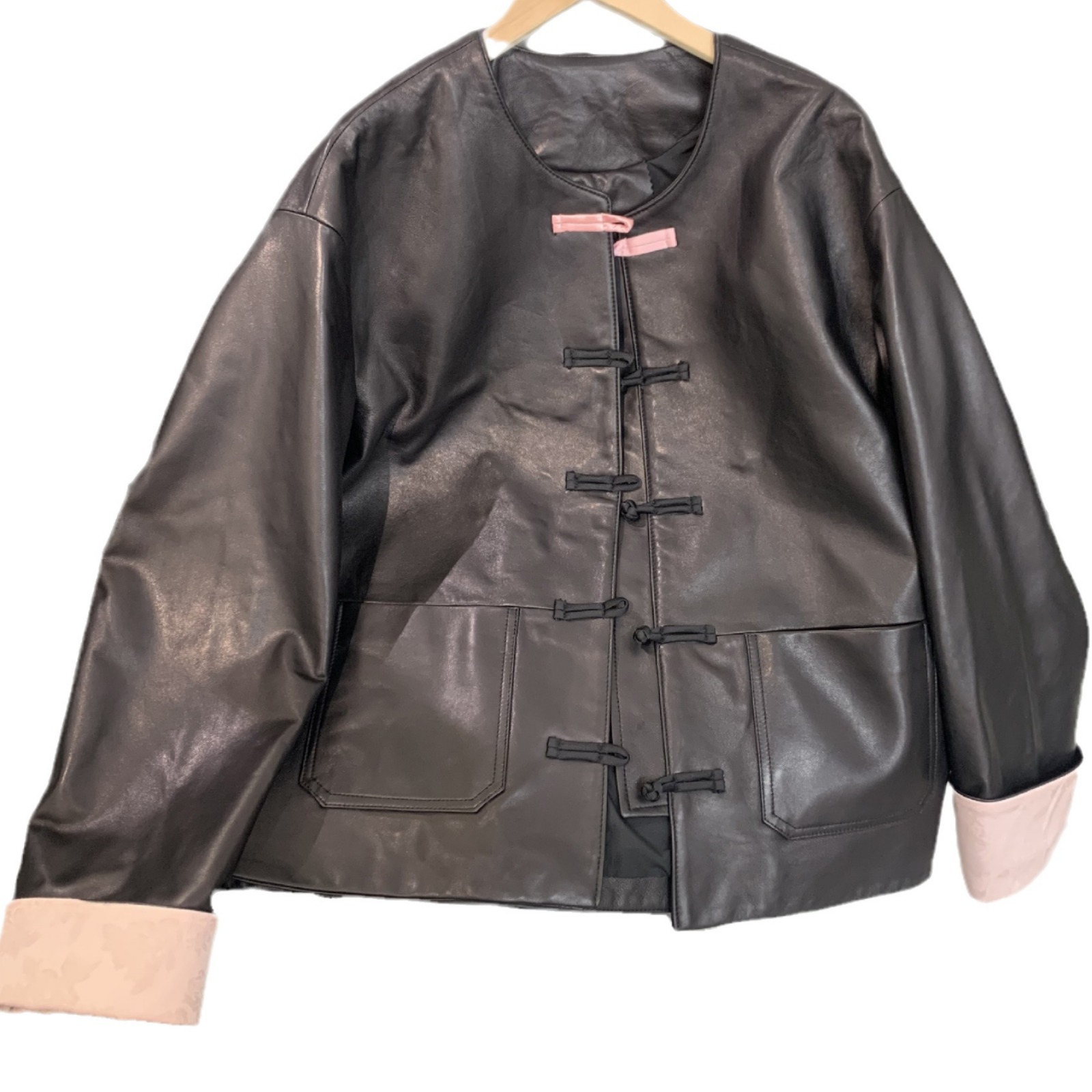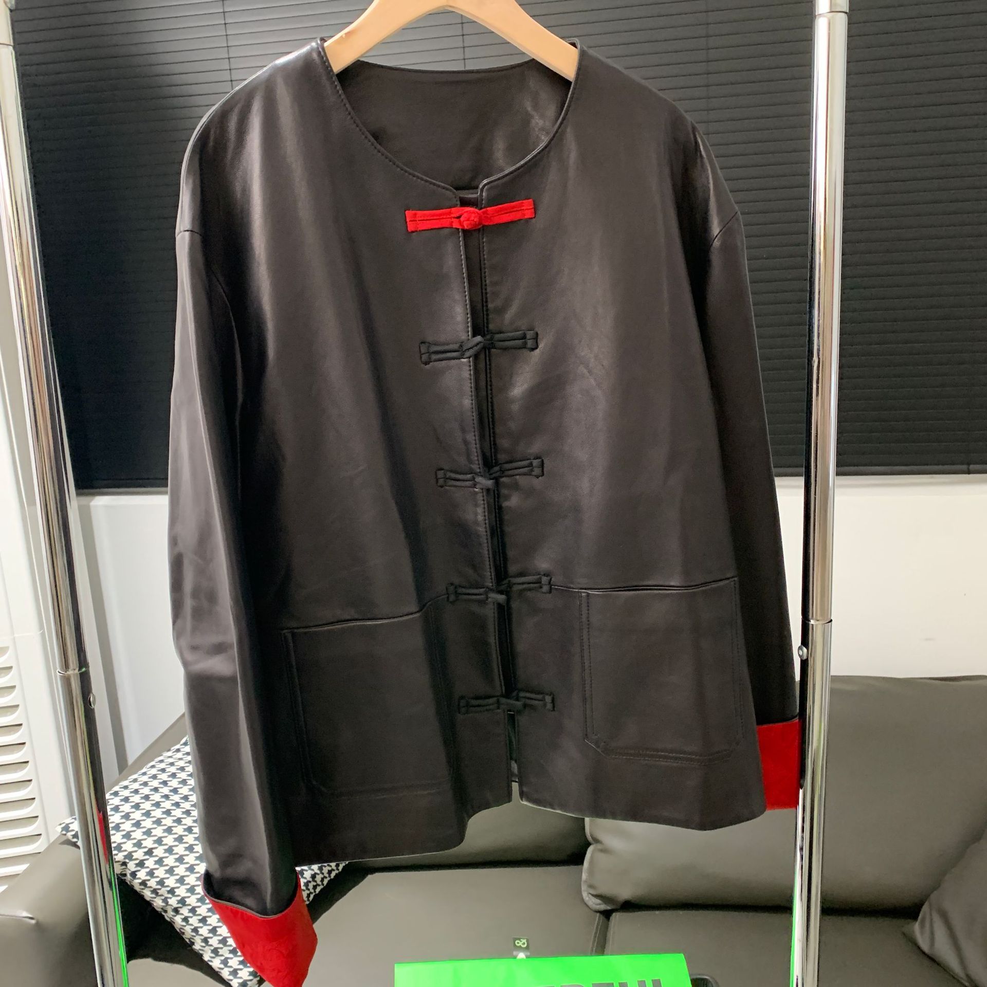 2024 Spring and Autumn New Genuine Sheepskin Vegetable Tanned Leather Coat New Chinese Contrast Color Button Loose Leather Jacket Coat