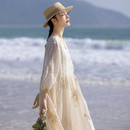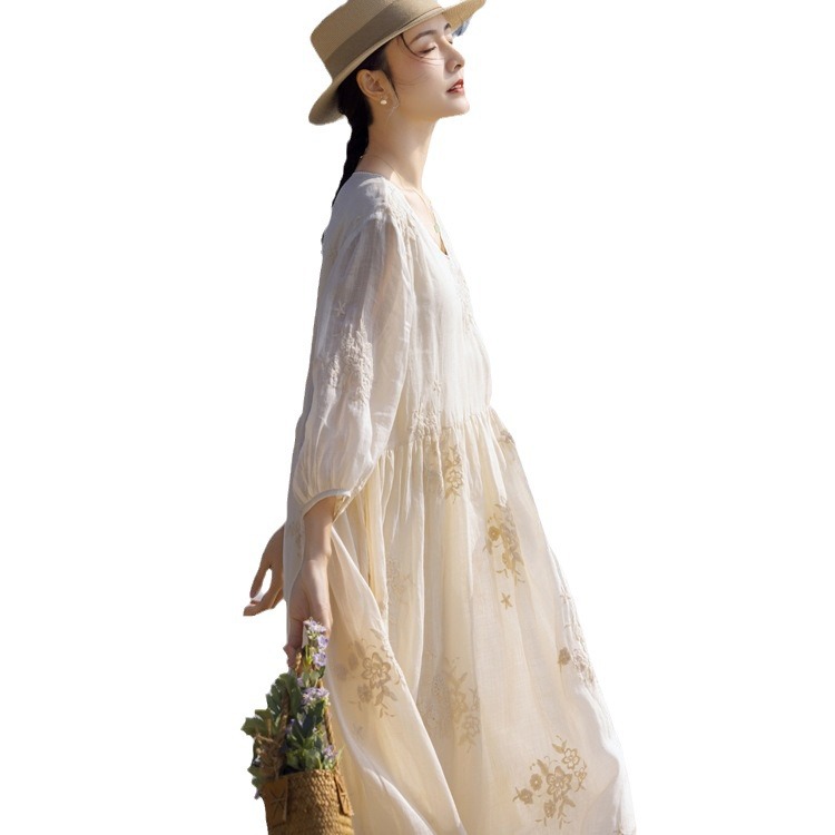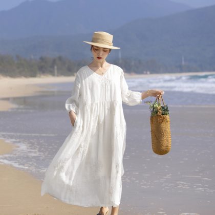 | nameOriginal | 2024 spring and summer loose Ramie high-end heavy embroidery French V-neck travel elegant fairy white dress |