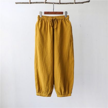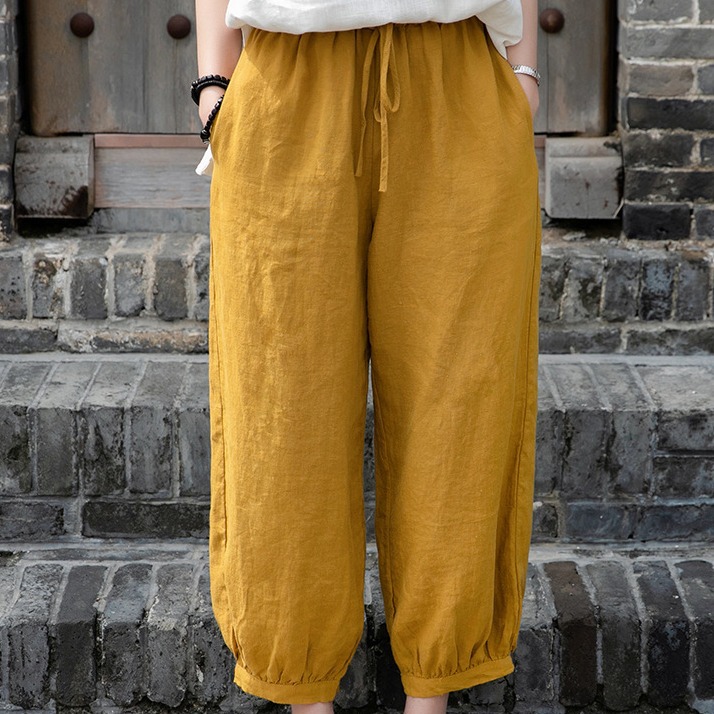 2024 spring and summer new cotton and linen women's clothing artistic retro loose casual linen women's pants elastic waist cropped bloomers