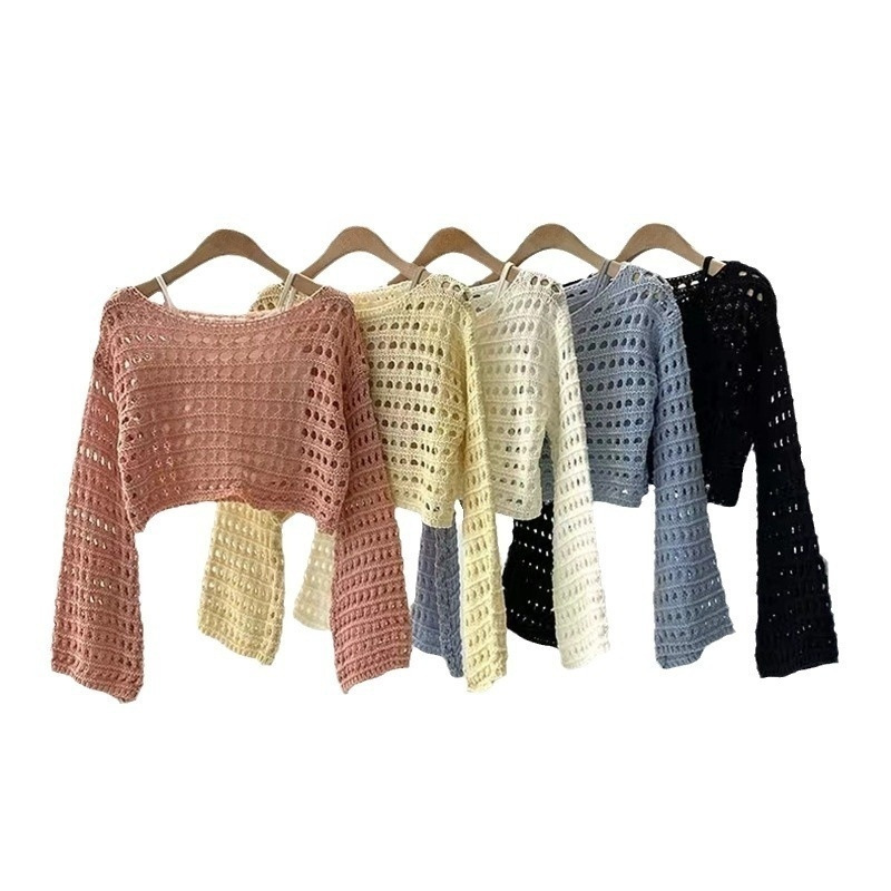 سترة نسائية محبوكة مجوفة بأكمام طويلة فرنسية جديدة لربيع وصيف 2024 بلوزة نسائية ذات تصميم رقيق واقي من الشمس