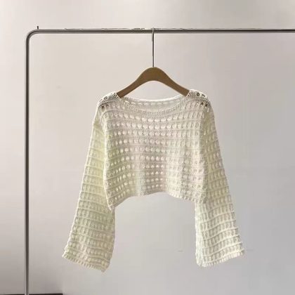 2024 Spring and Summer New French Short Long-sleeved Hollow Knitted Sweater Women's Design Sense Thin Sunscreen Blouse Top