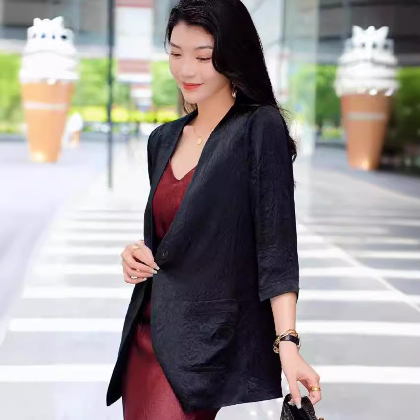 | nameOriginal | 2024 Spring and Summer New Women's Loose Seven-point Sleeve Pleated Texture Acetic Acid Satin Suit Jacket Draping Top |